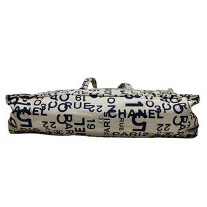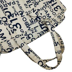 This rare and limited Chanel bag has ivory and navy blue canvas with Cambon Rue 31 CC Coco No 5 Chanel print