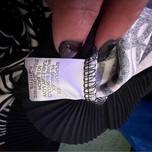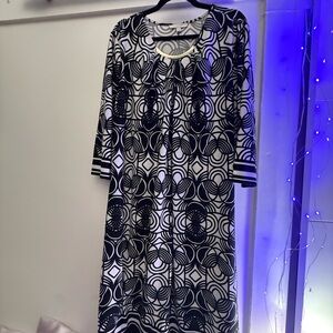Bold geometric print dress with a scoop neckline. Lightweight, drapey fabric for easy movement. Three-quarter sleeves with striped cuff detail. Classic black and white palette for versatile styling.