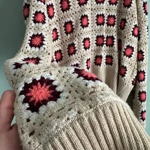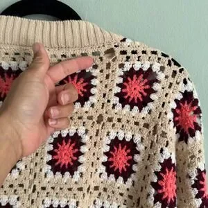PacSun granny square crochet cardigan features a vibrant floral-inspired pattern in pink, burgundy, and white against a tan base. Crafted from 100% cotton, this chunky knit sweater offers a relaxed fit with a button-front closure, V-neckline, and two front patch pockets adds structure to the bohemian, handmade-style aesthetic. Perfect for layering over basics to add a pop of color and texture.