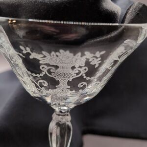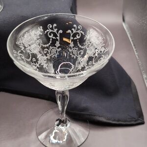 These stunning Champagne Sherbert Glasses are in the Fostoria Florentine Etched Pattern.