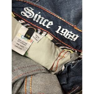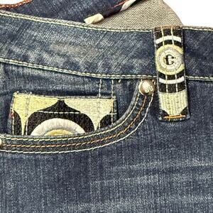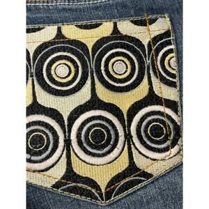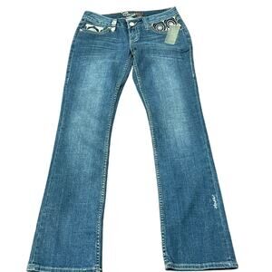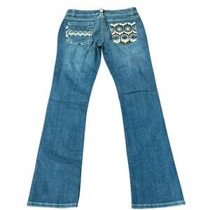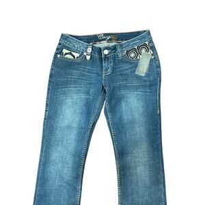 Color: Classic Blue Wash, Material: Denim, Condition: New with Tags (Retail $120), Distinctive geometric embroidery on back pockets, Flare leg for a vintage-inspired silhouette, Iconic Y2K aesthetic, Belt loops, zipper fly, and button closure.