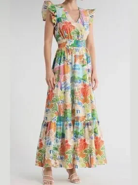 Vibrant tropical print maxi with flutter sleeves. V-neck and defined waist for a flattering fit. Flowing skirt with tiered hem for movement. Bright, summery palette ideal for warm-weather events.