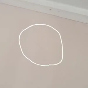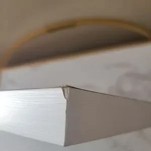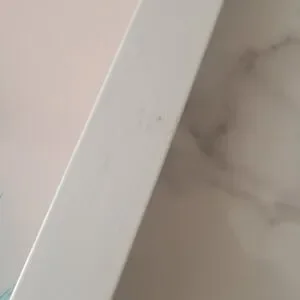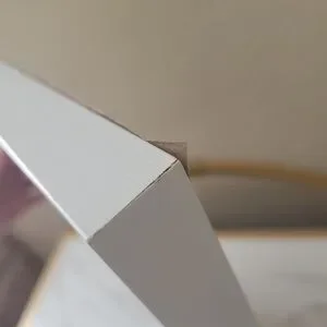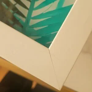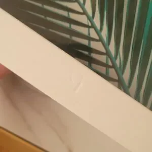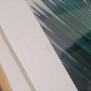 The front of the picture and frame has scuff marks, dents, a scratch, some small minor chips, and a scuff on the front plastic(pics. 1-8). The back has scuff marks and chips as well (pics. 9-12). Note: the picture and frame is completly plastic and is very lightweight.