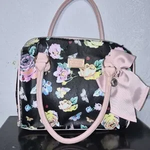 Betsey Johnson Black Floral Satchel with Pink Handles & Bow