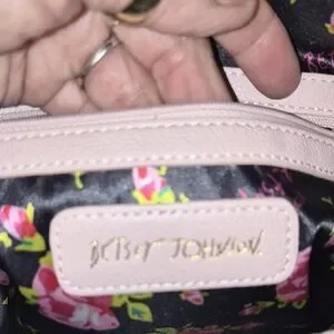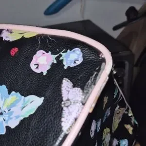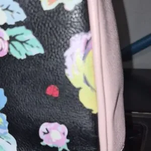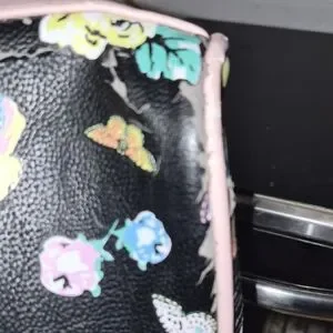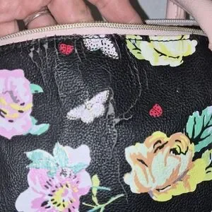Betsey Johnson satchel with colorful floral print on black. Pale pink handles and a matching bow accent. Gold-tone logo plaque and hardware. Compact, stylish carry for daily wear. Has a few faults but still in good condition for the price. It does has some faults . But not major.