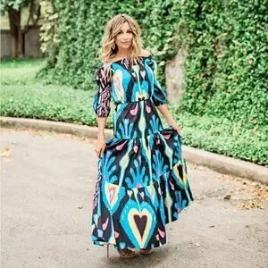 Sheridan French Women’s Size Medium Isabel Maxi Dress Black Blue Heart Ikat NWOT