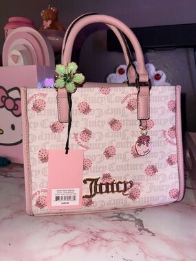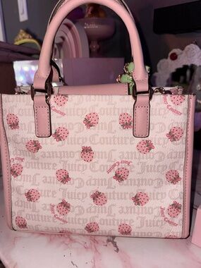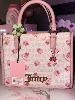 Charming Juicy Couture mini tote in soft white & pink with a strawberry print. Features gold-tone logo hardware and a playful strawberry charm. Smooth top handles and structured silhouette for everyday style. Perfect for adding a cute pink accent to your outfit.