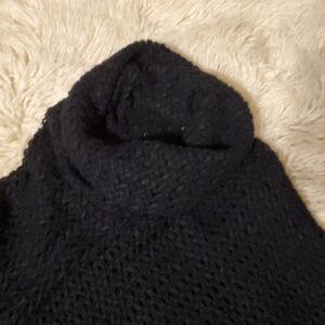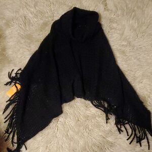 Stylish black knit poncho featuring fringe details. Perfect for layering.