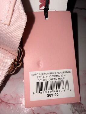 Soft cream & pink Juicy Couture mini shoulder bag with printed hearts and cherry accents. Gold-tone hardware and charm detail. Includes detachable crossbody strap and heart-shaped coin pouch. Feminine and playful style for everyday wear.