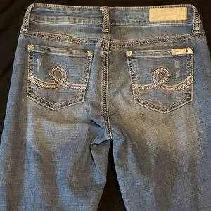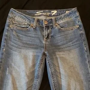 Very nice pair of Seven Rocker Slim, boot cut jeans in size 6. They are a medium wash with a distressed finish. Great condition, from a non-smoking home.