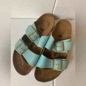 Women’s Birkenstock Arizona Washed Metallic Aqua Sandals Shoes 38