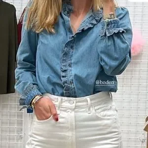 A versatile light blue denim blouse with delicate ruffle-trim detailing along the collar and button placket. Soft, breathable fabric for all-day comfort. Feminine ruffle cuffs and a relaxed fit for effortless styling. Pairs easily with jeans or skirts for a polished casual look.