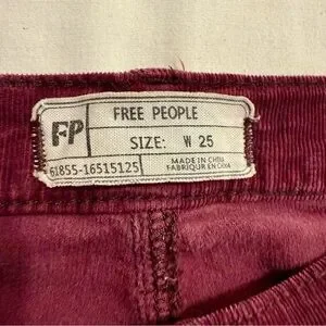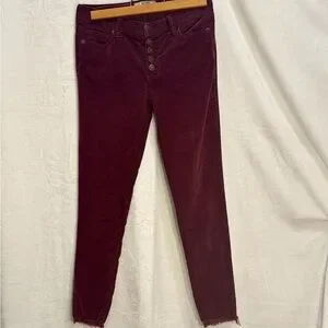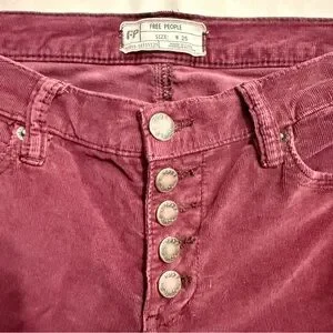 Elevate your wardrobe with these Free People Reagan skinny pants. Featuring a rich burgundy/maroon hue, these are crafted from soft, textured corduroy with the perfect amount of stretch for a flattering, "held-in" fit. The exposed 5-button fly and raw, frayed hems give them a modern, edgy twist on a classic style.