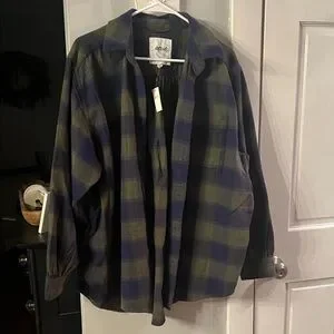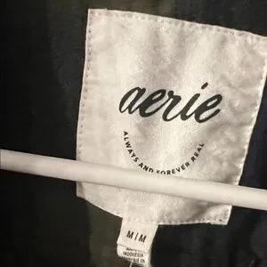 Oversized plaid button-up from aerie. Soft woven fabric with relaxed fit. Classic collar and front chest pocket. Easy to layer over tees or sweaters.