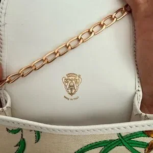 Gucci crossbody phone bag with bright floral print on a white canvas. Gold chain strap and gold-tone turn-lock detail. Slim silhouette holds essentials. Eye-catching botanical colors for seasonal style. unbranded chain pre-love condition.