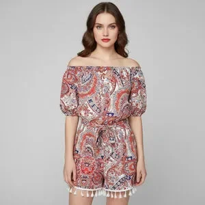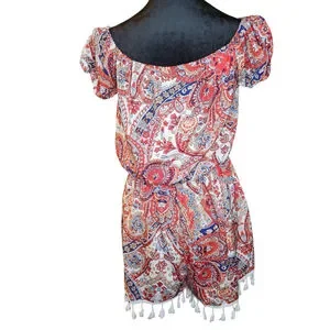 Women's Medium Red Blue Paisley Off Shoulder Shorts Romper Tassles