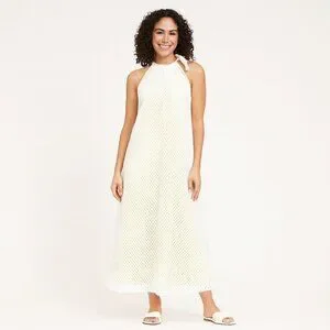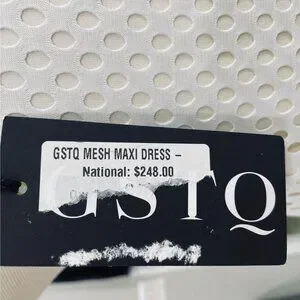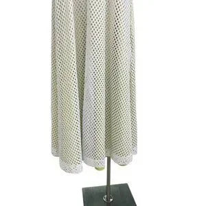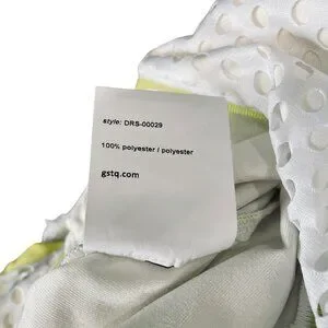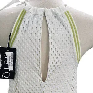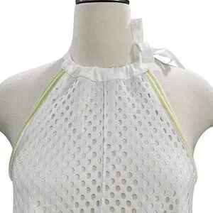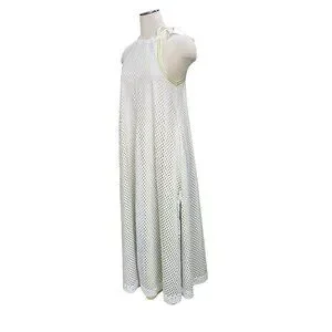 Elevate your summer style with this GSTQ Mesh Maxi Dress in White/Neon Sole, size XS. Designed with a chic halter neckline and side tie detail, this sleeveless dress features a breathable perforated mesh overlay with subtle neon accents for a sporty yet elegant vibe. Perfect as a stylish beach cover-up, resort wear, or casual summer outing dress. Crafted from 100% polyester for a lightweight, comfortable fit. Dress has some weight to it.