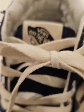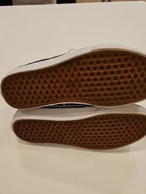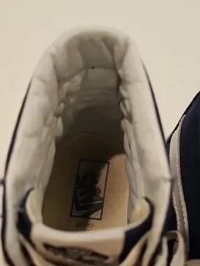 Classic Vans high-top silhouette. Navy canvas and canvas uppers with white side stripe and laces. Clean, versatile look for everyday wear. Good used condition. Externally they have minimal wear. Inside there is a little more wear from use. Plenty of wear left in them and still a very nice pair of Vans High Tops. Women's size 10.5 & Men's size 9.