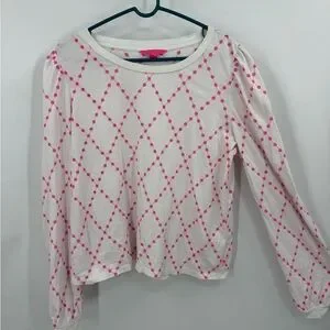 Lightweight long sleeve top. White base with pink diamond dot lattice all over. Crew neckline. Casual and feminine style. Soft, breathable fabric.