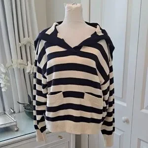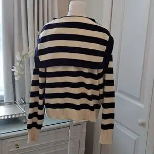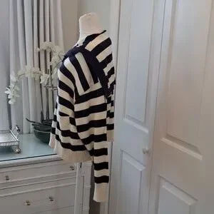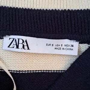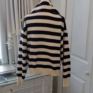 Trending brand Zara women's classic navy and ivory striped tunic style pullover sweater with v-neck front, front pockets and shawl back collar. Pre-owned and in very gently used condition. Please see pictures.