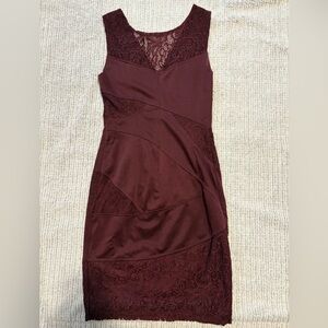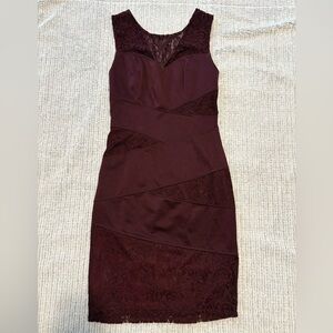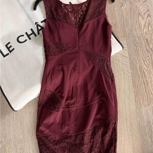 Elegant burgundy dress by Le Château. Features lace detailing. Perfect for special occasions. Dust bag not included.