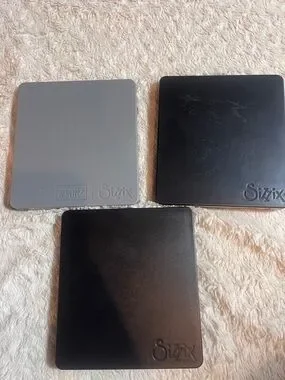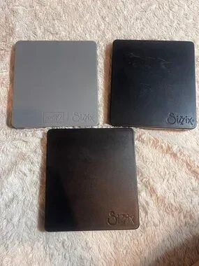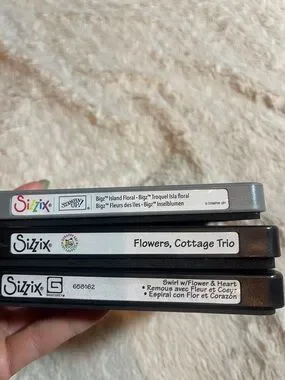 Three labeled Sizzix die cutting plates. Includes floral and cottage trio designs. Durable plastic construction. Compatible with Sizzix systems.