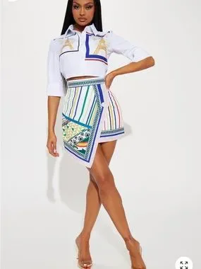 Cropped white button shirt with gold Eiffel Tower print and blue-red trim. Paired with a high-waist multicolor striped wrap skirt. Bright, playful colors and a chic, coordinated look.