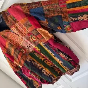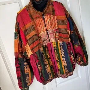 This unique piece displays a vibrant assembly of ikat and geometric textiles. The construction suggests it is a possible handmade item given the unique layout of the panels. It includes a full cotton lining for comfort and a sturdy front zipper. The elastic waist and cuffs provide a classic retro fit. Perfect for those who love a bold and eclectic look.