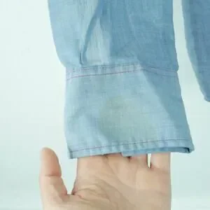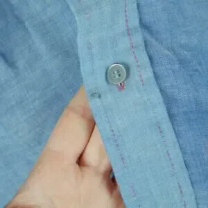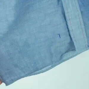 It is worn/distressed. Holes in collar from collar stays, large stain on sleeve cuff, torn on front near bottom, small stained areas throughout.