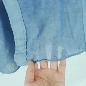 It has no brand or tags inside. I am estimating it to fit an XS/S. The fabric feels like a polycotton blend. It is a lightweight woven fabric.