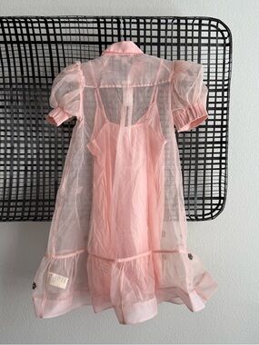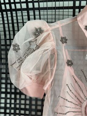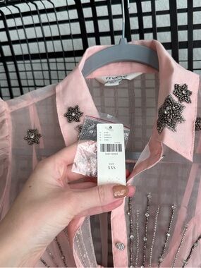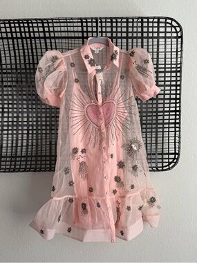 The Maeve mini shirt dress features short sleeves, embellishments, and a button front