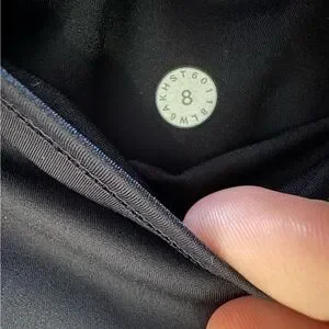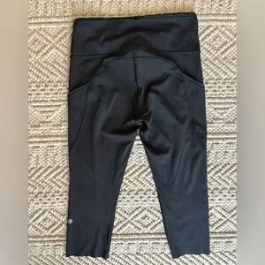 Lululemon black cropped leggings, size 8. Sleek athletic style with side pockets and reflective dot detail near the hems. Great for workouts, walks, yoga, or everyday athleisure wear.