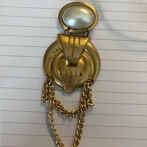 Extra large muted Gold Brooch with pearl and chains