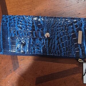 Shiny croc-embossed card holder in vibrant blue. Single snap closure and clear ID window. Zip coin pocket and wrist strap. Sleek and compact for everyday use. Sapphire Melboure