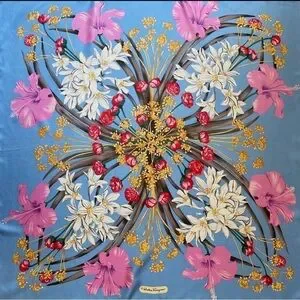 Elegant silk scarf with striking floral design. Features blue, pink, and gold hues.