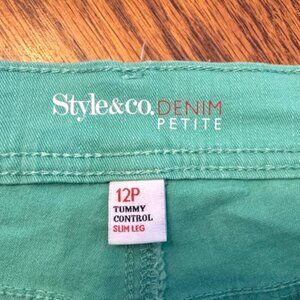 Style & Co. Straight Slim Leg Tummy Control Jeans, mint green, 12 Petite!