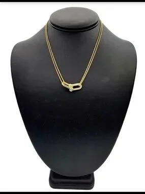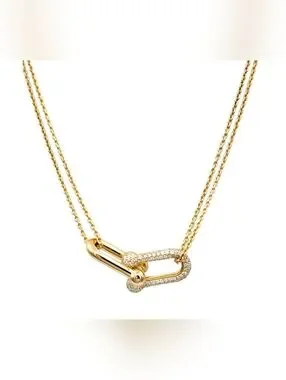 Dainty double-chain necklace with interlocking gold links. One link is polished gold. The other link is encrusted with pavé clear stones. Chic everyday or dressy accent.