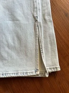 Abercrombie & Fitch Ultra High Rise Slim Straight jeans in a light wash denim with a straight leg and side slit hems at the ankle. Curve Love fit designed for a more contoured waist-to-hip fit. Classic five-pocket denim with button and zip closure.