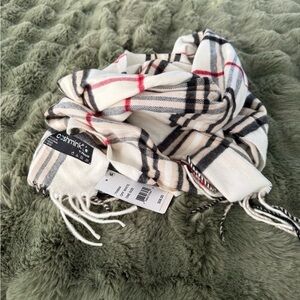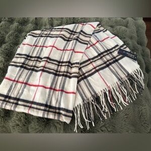 Elegant scarf with black and red stripes on an off white base. Soft and luxurious feel. Retails for $58