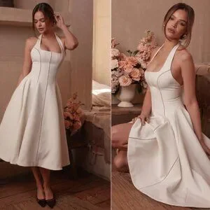 The sharp square neckline frames your décolletage, while the skirt flows effortlessly from the corseted waist with a vintage-inspired flair.