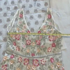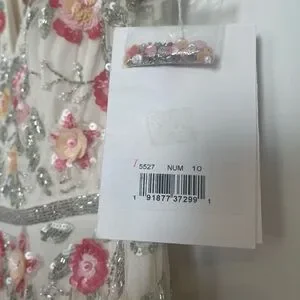 NWT Mac Duggal Cream Midi Dress with Pink & Green Floral Embroidery