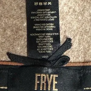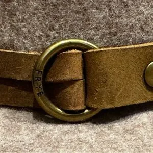 • Genuine leather band with brass buckle accent (stamped “FRYE”)