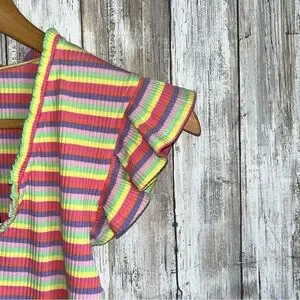 Vibrant striped top with ruffle sleeves. Features a mix of pink, yellow, and green stripes.