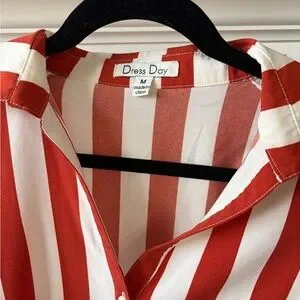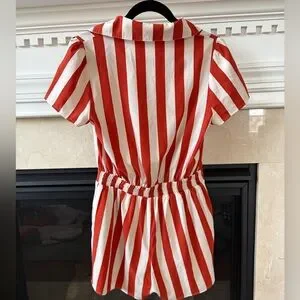 Red and white striped romper with short sleeves, pockets and a button-front. Lightweight, breathable fabric and a defined waist for a flattering fit. Easy, casual style ideal for warm days and weekend wear.