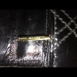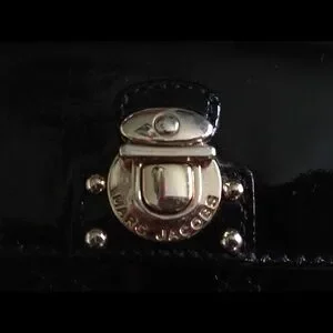 One of my favoritres, this wallet is shiny black patent leather with gold-tone hardware. There is a push lock signature embellishment but it is actually snap closure. 6 card slots, zippered change compartment, and currency pockets. While it does show some signs of wear with a couple of minor stains on the signature lining and a slight separation on the side. It’s still has tons of life left and measures approximately 7 1/2“ x 4“. Comes with original dust bag