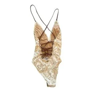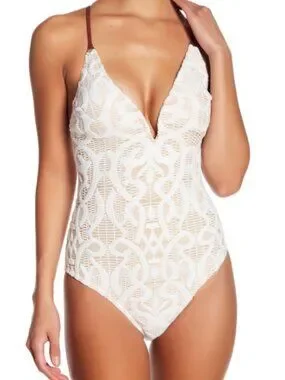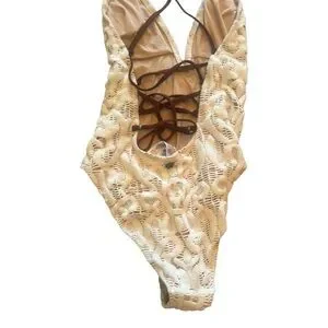 Nanette Lepore Goddess One-Piece Swimsuit in size Medium, new with tags. This stunning ivory lace swimsuit features a flattering deep V neckline and intricate crochet-inspired overlay for a feminine, elevated look. The back is a standout with adjustable brown crisscross straps and lace-up detailing, offering both style and a customizable fit.