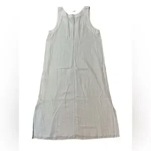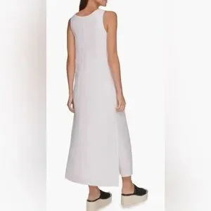 DKNY white sleeveless linen maxi with a V-neck. Minimal, straight silhouette. Side slit detail. Classic versatile style.