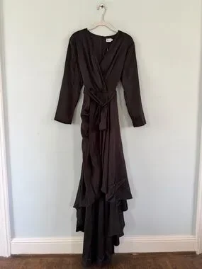 NWT Mooyius Ruffle Draped Satin Black High Low Formal Maxi Dress