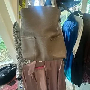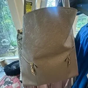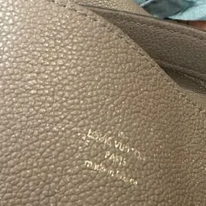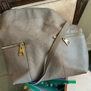 Louis Vuitton shoulder bag in a warm taupe leather. Embossed monogram pattern across the body. Gold-tone zipper and hardware accents. Single shoulder strap for easy carry. Neutral, polished look for daily use.