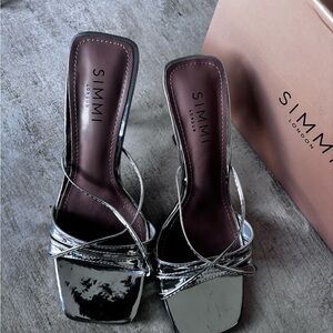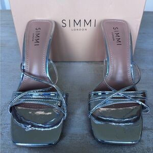 SIMMI London silver strappy mule heels with a modern square toe. Shiny metallic silver finish with delicate crossover straps for an elegant look. Easy slip-on design for versatile day-to-night styling.